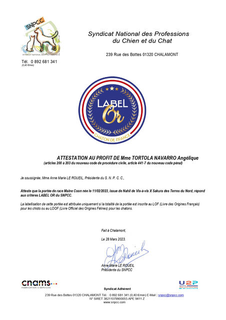 Cette démarche atteste de la sélection faite sur les parents des chatons qui naissent dans son élevage et selon des critères définis par le Conseil d’Administration du Syndicat National des Professions du Chiens et du Chats (SNPCC).